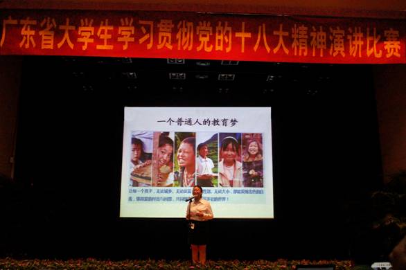 6月14日,由省委组织部、省委教育工委、省团委主办的“学习贯彻党的十八大精神演讲比赛”复赛在华南农业大学举行。这次比赛是为深入学习贯彻党的十八大精神,认真落实中央、省委关于开展“双学”(学十八大报告、学党章)活动的要求,活动主题为“学习贯彻党的十八大精神,让青春焕发绚丽光彩”。信息技术系学子陈虹妹代表我院参加了比赛。