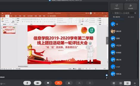 疫情如山,防控惟严;疫情无情,青春有爱。为了更好地提高我院青年学生新冠肺炎疫情防控意识,增强战胜疫情的信心和决心,为积极响应校团委开展线上主题团日活动的号召,近日,信息学院结合当前疫情防控形势,顺利举办了“战‘疫’团旗飘、青春勇担当”线上特别主题团日活动第一轮评比大会。