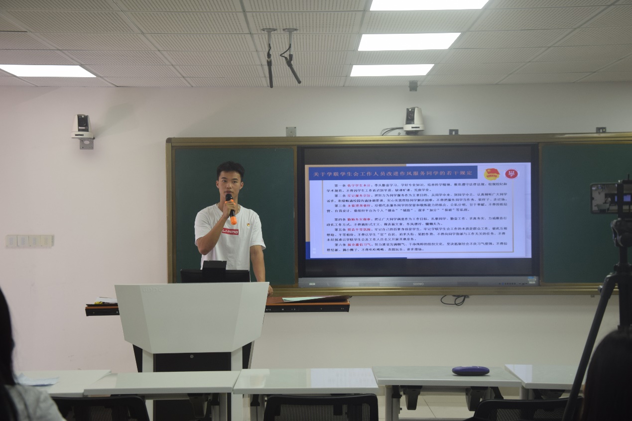 然后,信息学院团总支副书记许静儿为大家解读《广东省外语艺术职业学院学生干部管理办法(试行)》,从总则、岗位设置和任职条件、岗位任用和工作职责、教育培养和管理考核、廉洁自律和纪律监督五大方面进行解读。并现场讲解了关于推动高校学生会(研究生会)深化改革的问答,宣读关于学联学生会工作人员改进作风服务同学的若干规定。激励全体学生干部做到不忘初心、砥砺前行,用自己的行动,在平凡的岗位上,磨砺出不凡的成绩。呼吁大家团结一致,与时俱进,奋勇向前,以忠诚之心跟党走,以赤子之心为人民,以奉献之心报祖国!